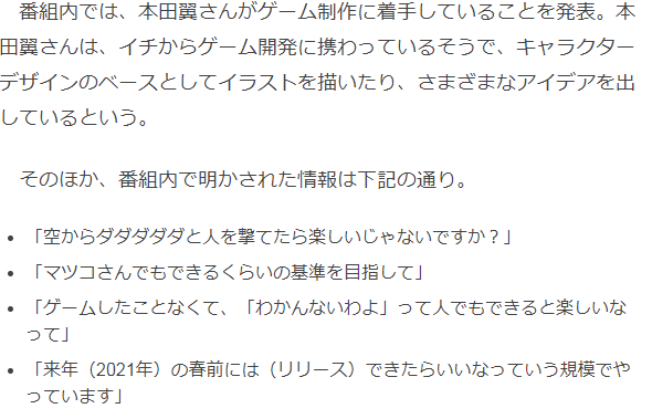 日本著名爱游戏明星、清纯系偶像本田翼在昨晚举行的节目中透露了将参与游戏开发的消息,而且合作对象是巨头微软,目前该游戏具体信息不详,不过或于2021年春季公开,敬请期待。6月13日昨天晚上,本田翼和另一位搞笑艺人MATSUKO一起参加了游戏直播的节目《MATSUKO会议》,2人一起现场玩了《动森》和《马车》游戏,同时透露了本田翼将和微软合作参与游戏开发的消息,具体情报如下: