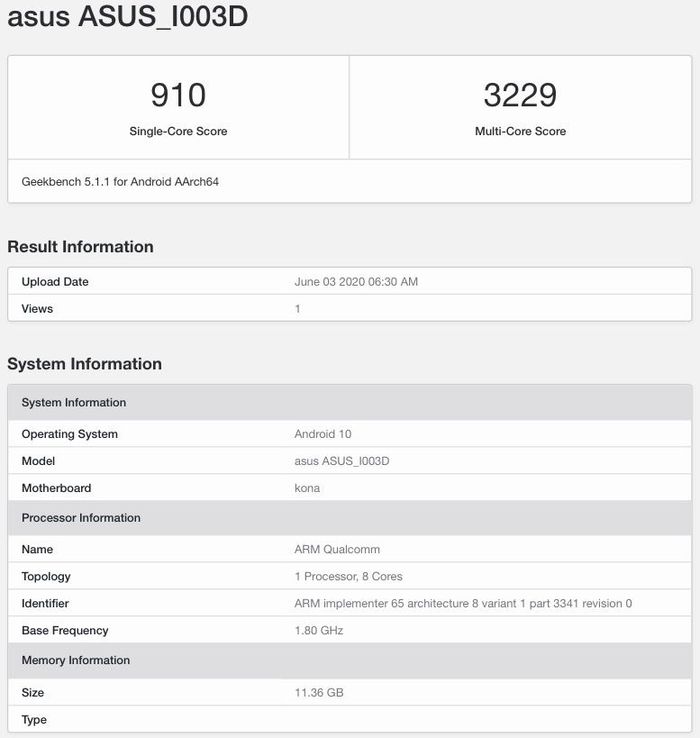 目前 8GB 和 12GB 的 ROG Phone 3 都在 GeekBench 跑分库现身,跑分信息显示这款手机搭载骁龙 865 处理器,运行 Android 10 系统。12GB 机型在单核测试中成功获得910分,多核测试中获得3229分。8GB内存机型分别取得了902分和3074分。