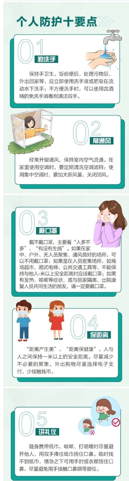 二、请时刻保持个人防护意识,科学戴口罩,勤洗手,长通风,保距离。积极响应爱国卫生运动各项举措,定期清扫保洁。
