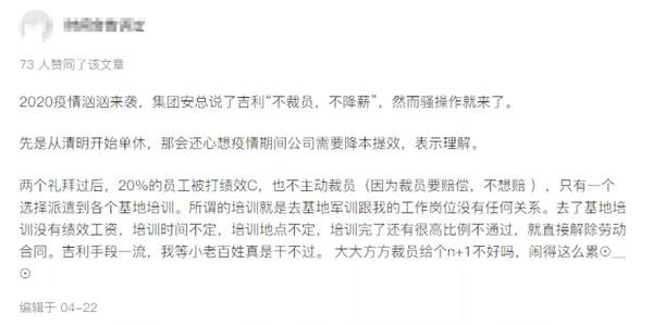 作为国产车中的一哥品牌,吉利在面对市场寒冬时,能够有更多的实力抵御。此前,在疫情最为严重的时候,吉利汽车曾公开声明,不会裁员,降薪,大家共同度过难关。如今,吉利对员工公布了“蓝海计划”,因为大幅降薪,被质疑为变相裁员,有消息显示,比例大概为普通员工裁员20%、管理层优化30%。并且有员工针对此事在网上发帖吐槽。