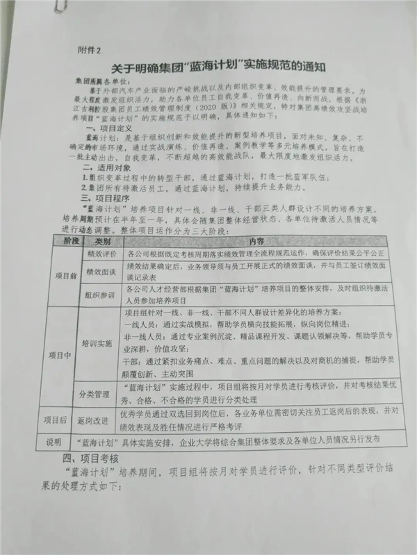 据了解,吉利“蓝海计划”从今年5月份正式启动,绩效被评为C的员工需要在5月中旬开始进行为期近一个月的培训。
