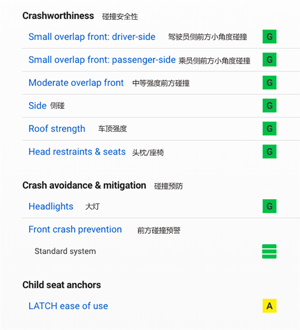要拿到IIHS的 TOP SAFETY PICK+,就必须在驾驶员侧前方小角度碰撞、前方中等面积碰撞、侧面、车顶强度和头部约束测试以及乘客侧前方小角度碰撞、前大灯测试中都拿到G。此外,前方碰撞预警要拿到先进或优越的评分,特斯拉交上了一份近乎完美的答卷。