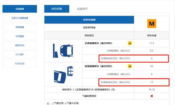 根据测试规则,气囊引爆会让该项成绩直接变为P(就是说低速碰撞你就给我引爆气囊,纯属浪费钱),大家理解一下。