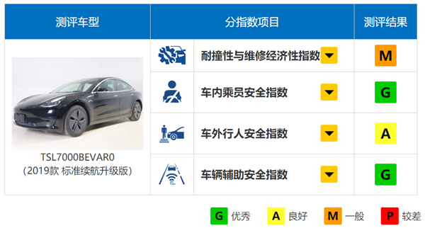 6月10日,中保研公布了国产特斯拉Model 3的碰撞测试评价结果。结果显示,车内成员安全指数、车辆辅助安全指数两项获得优秀(G)评价;车外行人安全指数获得良好(A)评价;耐撞性与维修经济性指数获得一般(M)评价。