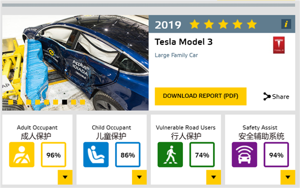 ▲ 特斯拉Model 3 在E-NCAP的得分