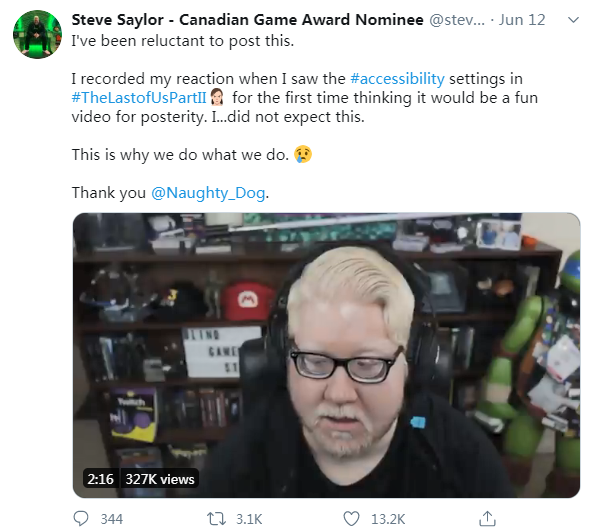 ·至于这套系统究竟如何的神奇,近日一位资深业界盲人玩家史蒂夫·塞勒在直播试玩《最后的生还者2》时深深被该套系统震撼和打动,真情流露忍不住热泪盈眶,非常感谢顽皮狗工作室。