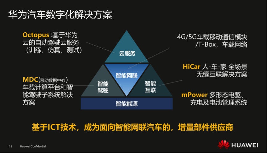 华为将智能汽车解决方案 BU 的业务覆盖范围划分为五个部分:智能驾驶、智能座舱、智能网联、智能电动、智能车云。但更重要的是,华为定义新 BU“做智能网联汽车增量部件供应商”。