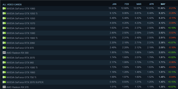不过有趣的是,GTX 1650虽然是图灵家族的最低档成员,但却也是最受欢迎的,Steam最新硬件调查排行榜上排名第五,它前边的都是GTX 10系列,而在后边GTX 1660 Ti、RTX 2060分别排第七、第八名。