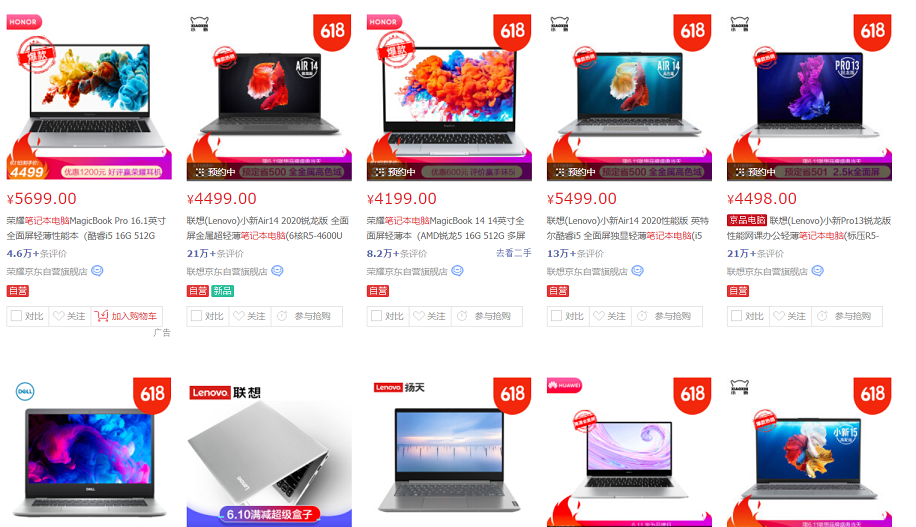 随着 6.18 活动日益火爆,现在已经有不少品牌在电商平台开始为笔电产品打出各种促销优惠活动:对于发布时间更早的十代酷睿轻薄本来讲,到了今年6月,各家高性能与追求设计感的笔电新品也都已经陆续发布;同时在电商平台中,不少早先发布的十代酷睿轻薄笔电在 6.18 期间仍然凭借较大的优惠力度带来的高性价比,重新登上电商平台热销榜。