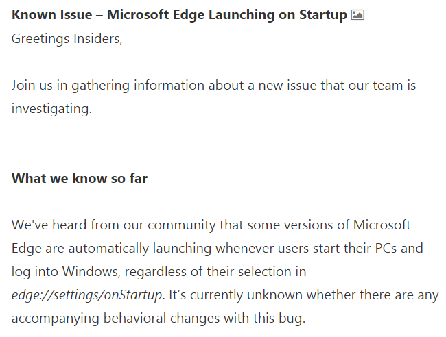 根据用户的反馈,无论在 edge://settings/onStartup 中进行了哪种设置,无论何时启动 PC 并登录 Windows,部分 Microsoft Edge 都会随系统启动而启动。也就是说,开机并进入桌面后,Microsoft Edge 便会自动启动。