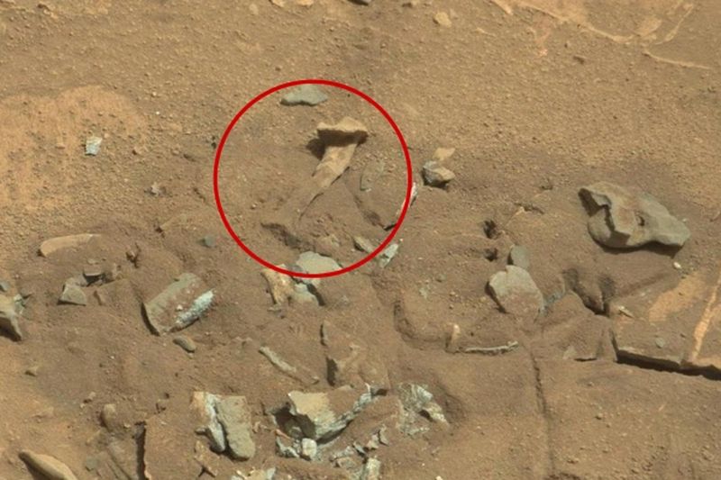 照片显示,在火星表面的尘埃中散落着数块石头,而其中一块看起来十分像人类的大腿骨。