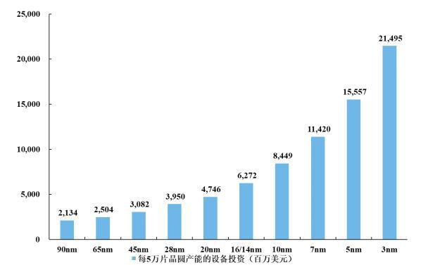 上图显示了建设每5万片晶圆产能的设备投资,28纳米工艺时只有39亿5千万美元,到5纳米就涨到了155亿5700万美元,3纳米高达214亿9500万美元。