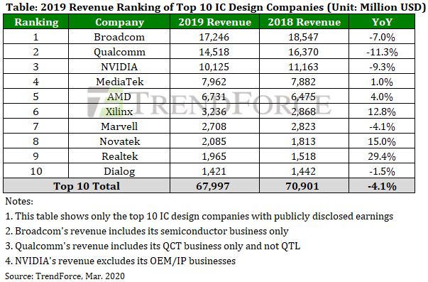 根据半导体行业分析公司TrendForce的统计,2019年全球前10无生产厂的IC设计公司中,有6家是美国公司,分别是博通、高通、英伟达、AMD、赛灵思、迈威、这些公司目前全都是台积电的客户。