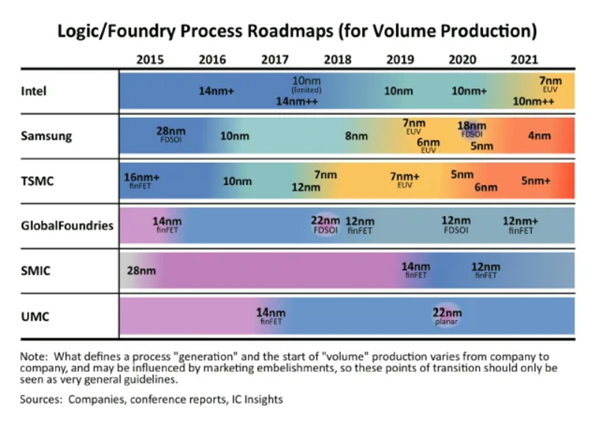 根据IC Insights的资料,目前全球能够制造10纳米以下线宽的半导体企业只有三个:英特尔,台积电(TSMC)和三星,其中,台积电的技术是最先进的。