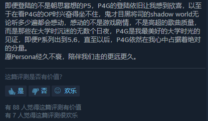 在Steam的评论区上,有玩家说道:“即便登陆的不是朝思暮想的P5,P4G的登陆依旧让我感到欣喜,以至于在看P4G的OP时兴奋得坐不住……那些在大学时沉迷的无数个日夜,P4G是我最美好的大学时光的见证,即便P系列出到5,6,直至以后,P4G依然在我心中占据着绝对的分量。”