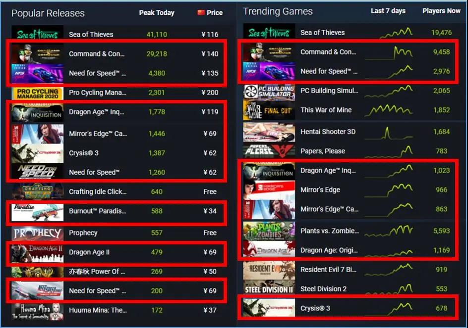 但最后并不等于最差,如果玩家仔细观察Steam上的游戏排行榜,同样会发现一件有意思的事情——作为游戏食物链最后一环的Steam,其上架的经典游戏销量反而是最好的。比如前段时间与EA开展合作后,Steam平台重新上架多款EA旗下经典大作,而EA也上演了对Steam趋势榜和当日畅销榜的“屠榜”操作,这背后的直接原因是Steam玩家的强烈购买欲。
