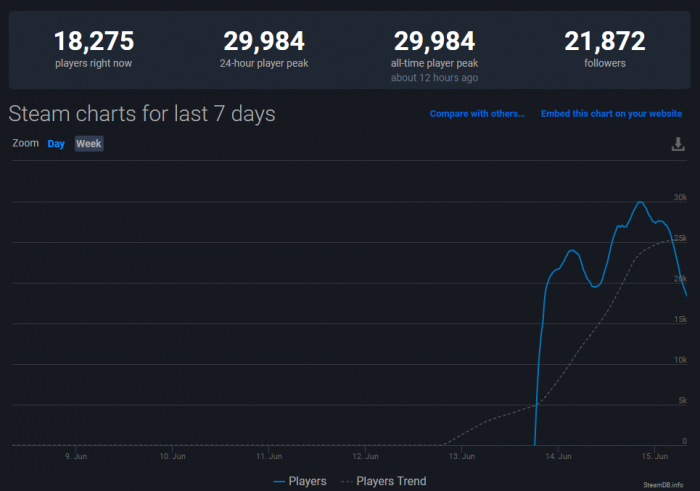 尽管游戏已经走过了近8个年头,但时间依旧没有冲淡玩家们的热情。据SteAMDB的数据显示,P4G上线首日,Steam上的热门榜、畅销榜、趋势榜三榜头名均被P4G占领,同时游戏的在线人数峰值也达到了29984,打破了Steam上JRPG同时在线玩家记录,游戏整体好评率高达93%。
