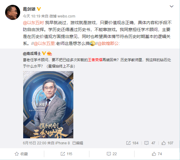 对于此次担任王者荣耀学术顾问,葛剑雄在个人微博表示:“我早就说过,游戏就是游戏,只要价值观念正确,具体内容和手段不防自由发挥。学历史还得通过历史书,不能靠游戏。我同意担任学术顾问,主要是在历史价值观方面提出意见,同时也希望具体情节符合历史时期基本的逻辑关系。”