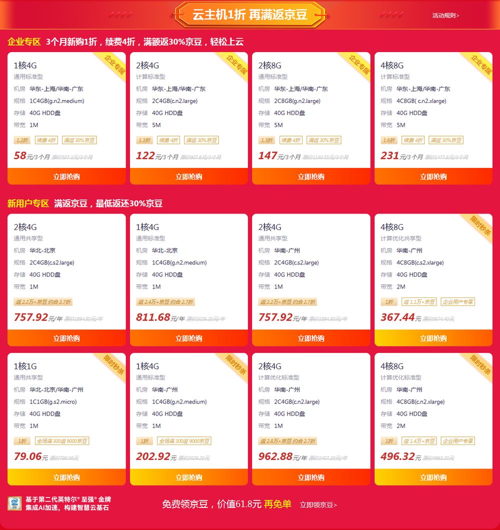 云服务器仅限新注册用户优惠购买,云数据库以及云安全产品老用户和新用户都可以购买的。同时,如果我们消费满一定金额还可以得到赠送的京东豆。企业应用,比如短信、智能建站,市场营销类产品也都有活动,我们有需要看看的企业商家或者个人看看是否有需要的。