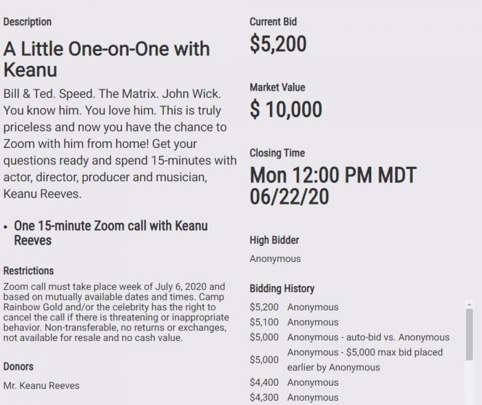 基努·里维斯正在拍卖和自己一对一视频15分钟的机会,来为爱达荷州儿童癌症慈善机构Camp Rainbow Gold捐款。这次拍卖将持续到当地时间6月22日,除了基努里维斯之外,配音演员Rob Paulsen和音乐家Ally Brooke也加入了这次慈善拍卖活动。