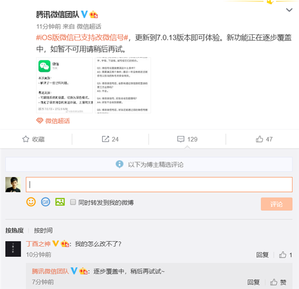 今天下午(6月16日),腾讯微信团队表示,iOS微信已发布7.0.13版本,相关用户升级后即可修改微信号。据悉,入口是“我”-“个人信息”-“微信号”,符合条件的用户支持一年修改一次微信号。微信团队同时提醒,新功能正在逐步覆盖中,如暂不可用请稍后再试。 根据之前安卓版的经验,不可用的话可尝试退出账号重新登录。