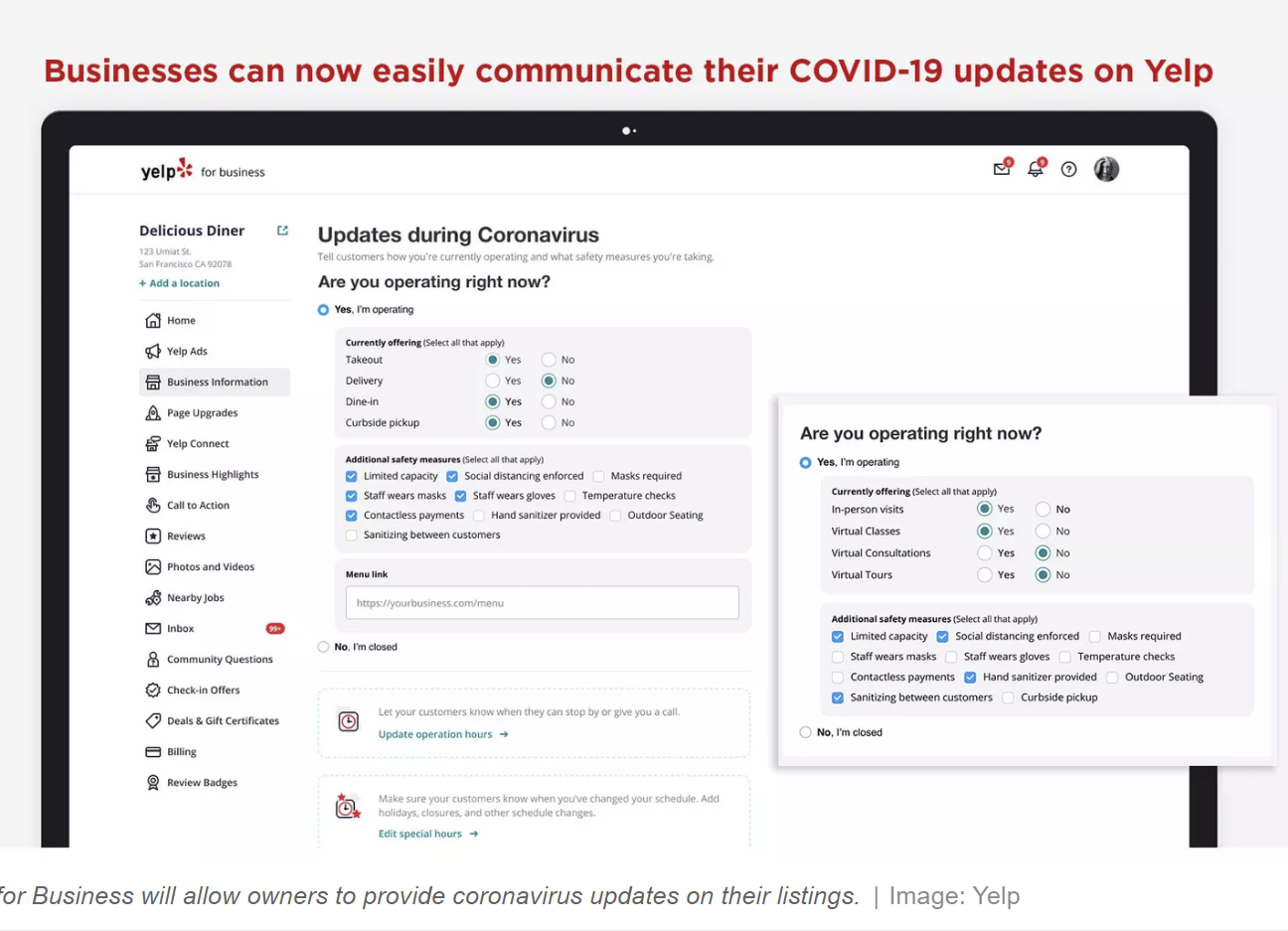 随着美国各地的餐馆开始重新开业,Yelp正在推出新的工具,让企业主分享他们为保证顾客和员工安全而采取的安全措施。Yelp将在今天为平台上的企业推出一个新的COVID-19栏目。位于企业名称和评论之间,该部分将让企业主展示他们将提供的服务,如室内或室外餐饮,以及他们采取的安全措施,如体温检测等等。