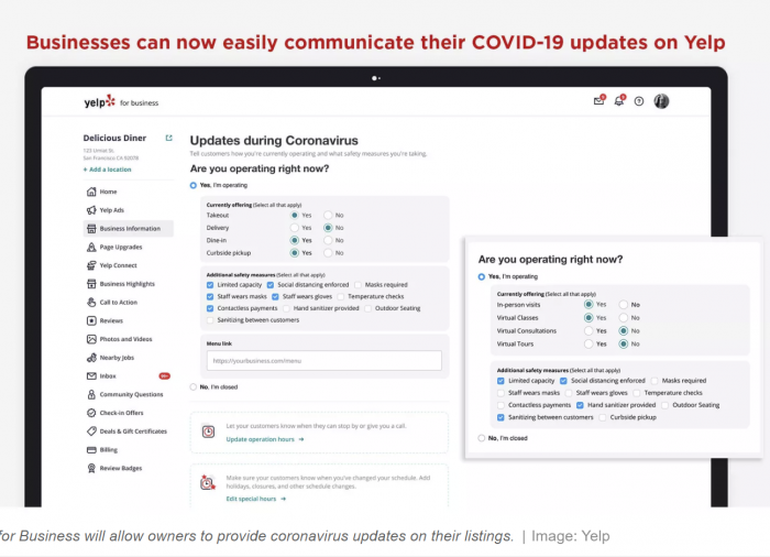 3月初,Yelp推出了第一套与COVID-19相关的工具,比如商家可以选择让顾客知道自己是暂时关闭还是只开放送餐或外卖订单。它还推出了一个2500万美元的基金,为当地企业提供免费广告和Yelp服务。