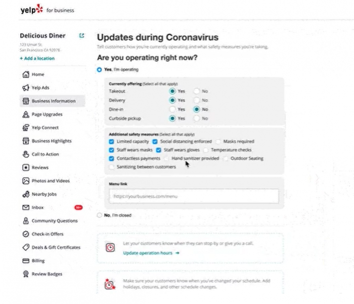 在COVID-19部分下将有一些不同的属性。商家可以勾选是否遵守不同的安全措施,如非接触式支付或强制员工戴口罩和手套。Yelp还表示,每次企业主更新COVID-19部分时,都会公布一个时间戳,这样顾客就可以看到营业时间或业务更新等信息是否是最新的。企业可以自行添加和更新所有这些信息,但他们必须在Yelp上申请他们的列表,并登录他们的Yelp for Business账户进行操作。消费者在检查到某家企业后,也可以验证Yelp上任何企业的健康和安全准则。
