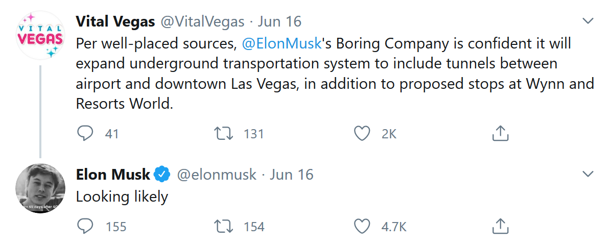 据外媒报道”,最新曝出的信息可能真的会改变“赌城”拉斯维加斯人在这座城市的出行方式。在回应一名Twitter用户关于无聊公司(The Boring Company)的隧道是否可能会在拉斯维加斯机场和拉斯维加斯市中心的其他地方找到位置时,这家公司的CEO埃隆·马斯克回应称,这样的项目“看起来很有可能”。
