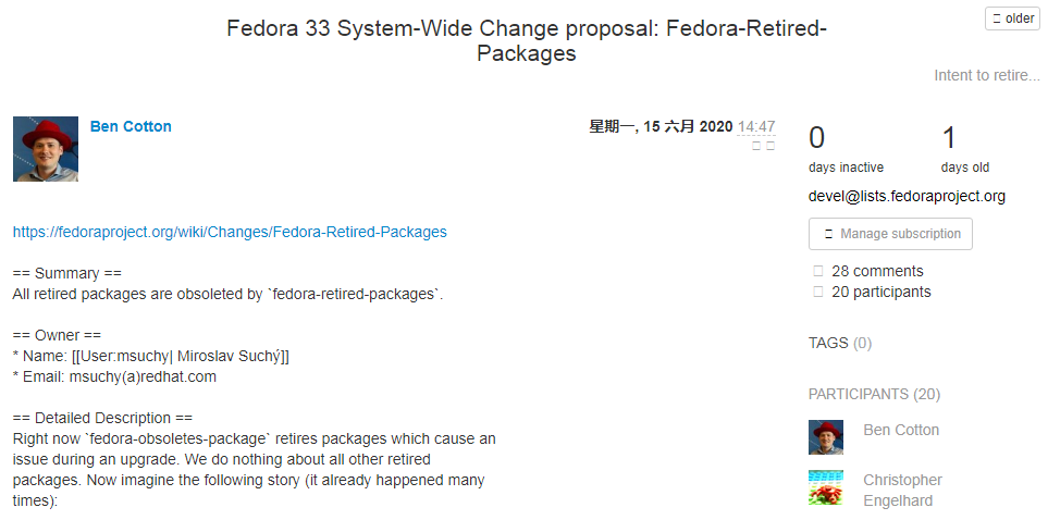 而对于目前的 fedora-retired-packages 提案,它会淘汰当前最新版本发布之后退役的软件包,然后在升级时删除此软件包。这个提案在 Fedora Wiki 上有完整的阐述。