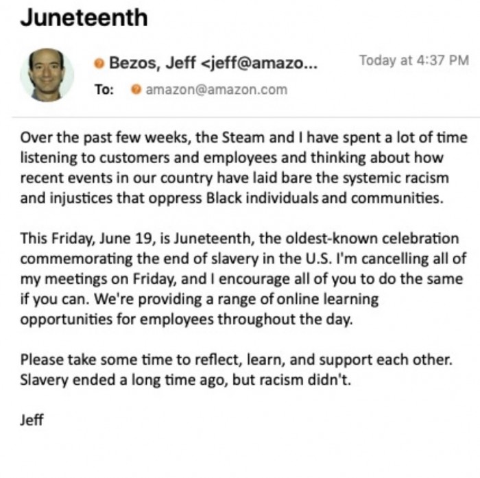 贝佐斯在邮件中称,他拿出了大量时间来思考近期引发“黑人的命也是命”运动的事件,决定在周五取消自己的所有会议安排。尽管他并未将“六月节”定为亚马逊的正式节日,但是他鼓励所有员工也在周五取消所有会议,并表示公司会全天提供有关“六月节”的在线学习机会。