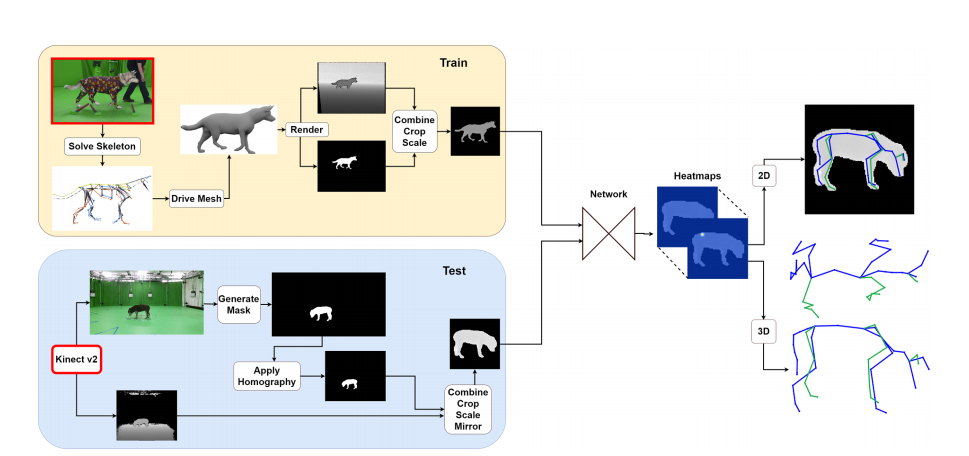 这个模型的设计是为了预测和复制狗狗在拍摄时的姿势,而不需要穿上它们的动作捕捉服。该团队能够做到这一点,利用一台RGBD相机创造出新狗的数字形态,与普通数码相机不同的是,这台相机除了记录每个像素的红、绿、蓝三色外,还记录了与主体的距离。