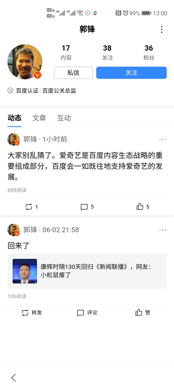 针对外媒报道的百度向腾讯出售爱奇艺股权一事,今日,在百度App上实名认证为“百度公关总监”的郭锋做出回应称:“大家别乱猜了。爱奇艺是百度内容生态战略的重要组成部分,百度会一如既往地支持爱奇艺的发展。”此前,外媒报道称,腾讯计划成为爱奇艺的最大股东。