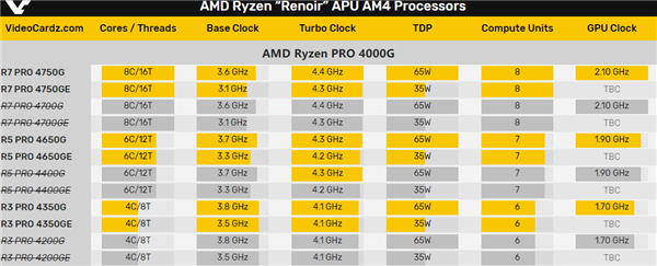 如无意外,35W GE系列的三款型号也会改名,分别变成锐龙7 PRO 4750GE、锐龙5 PRO 4650GE、锐龙3 PRO 4350GE。