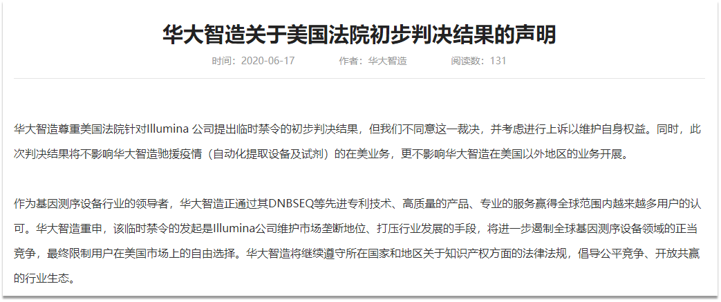 针对初步判决,6月17日华大智造对外发表《关于美国法院初步判决结果的声明》。
