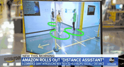 “Distance Assistant”是一款AI智能检测系统,它能够实时监测并反馈某空间内流动员工之间的社交距离。如亚马逊仓库的视频所示,当员工之间的社交距离小于6英尺时,他们脚下就会闪烁红色的圆圈,反之闪烁绿色,而这些所有信息都会通过显示屏得到实时、精确的反馈。
