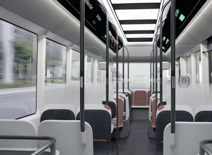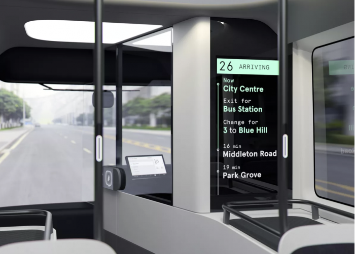 公交车外部和顶部环形的显示屏,可以用来指示哪些门最适合上车等。还有更多的屏幕,沿着内部的顶部,可以提供即将到来的站点信息。很容易想象这些屏幕被用于更多的动态广告,这也是大多数现有公交车所不可能做到的。