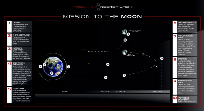 从弗吉尼亚州火箭实验室的新发射场发射后,Electron火箭将首先把安装有CAPSTONE卫星的光子航天器部署到绕地球的低圆轨道上。从那里,光子航天器将慢慢拉长轨道,使飞行器离地球更远。最终,光子航天器将启动其HyperCurie引擎,并使其驶向月球。总的来说,到达光子航天器部署CAPSTONE飞船的合适地点大约需要八到九天的时间。