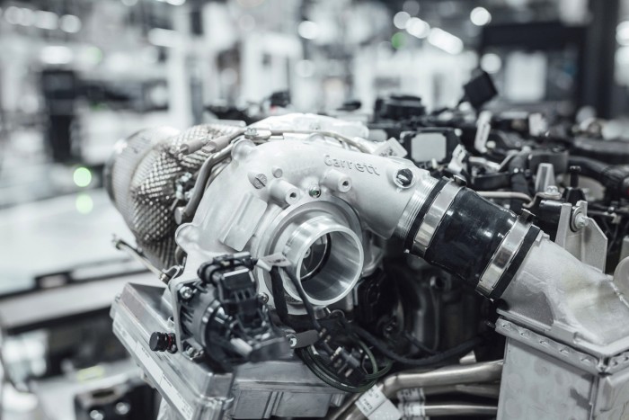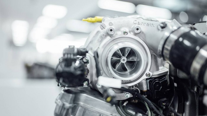 这项技术是与Garrett Motion合作开发的,直接来自F1。开发过程中,旨在解决一个小而反应快的涡轮增压器与一个大而有力的涡轮增压器之间的矛盾目标,因为这两个涡轮增压器产生的功率不大,而大而有力的涡轮增压器却存在涡轮迟滞的问题。电动废气涡轮增压器的亮点是一台尺寸约4厘米的超薄电动机,它直接集成在排气侧涡轮轮和新风侧压缩机轮之间的增压轴上。电控电机可以驱动压缩机,排除废气流量,其结果是,通电涡轮增压器显著提高了从至关重要的即时反应和整个发动机转速范围。同时,在整个转速范围内消除了涡轮延迟。
