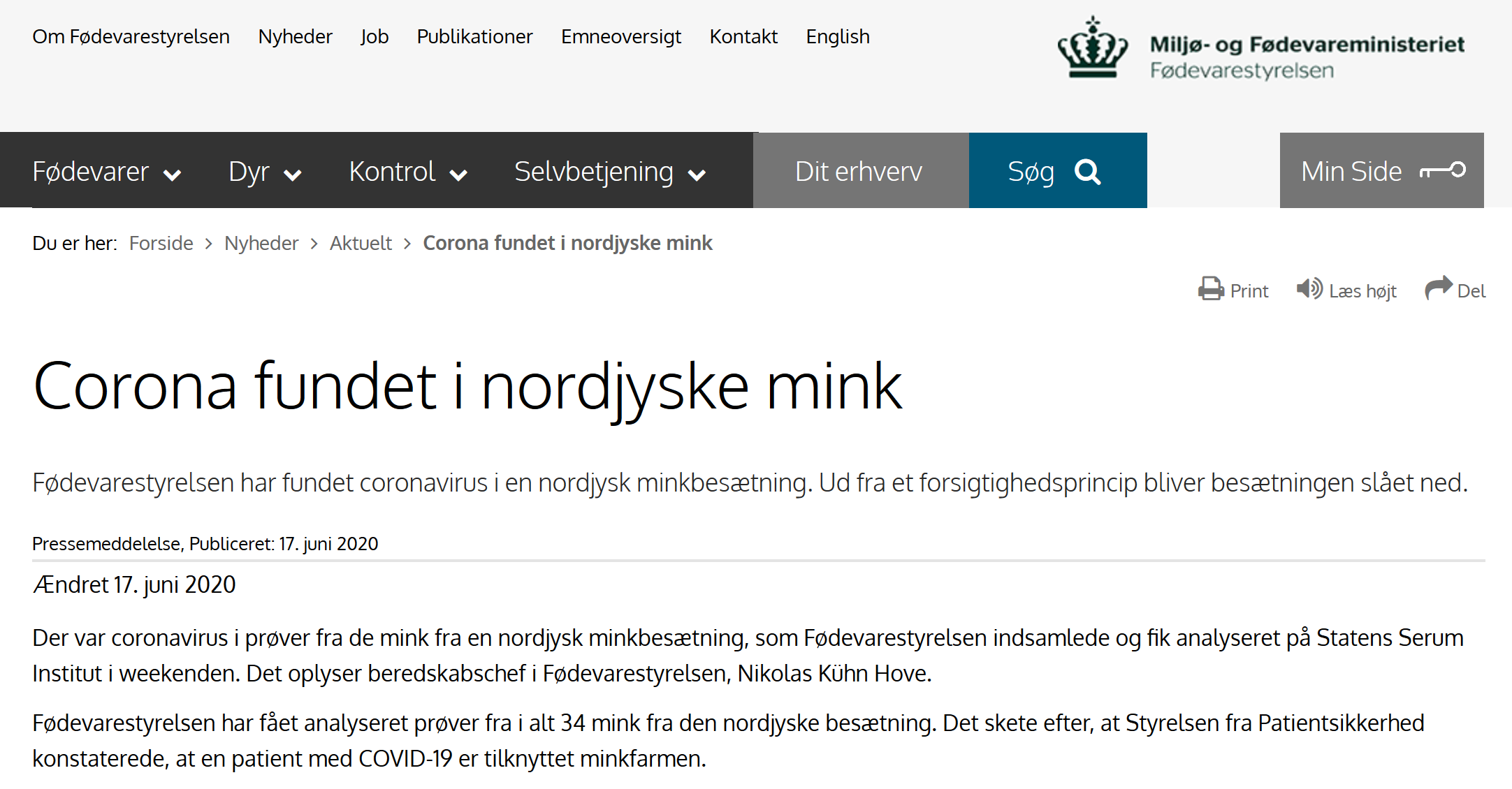丹麦兽医和食品管理局17日发表新闻公报说,上周末在一家貂养殖场对34只貂采样检测后发现,貂体内有新冠病毒。公报说,这家貂养殖场在北日德兰岛。因一名与养殖场有关联的人员近期确诊感染新冠病毒,兽医和食品管理局对貂群也进行了采样检测。这是首次在丹麦养殖的貂群中发现新冠病毒,出现症状的貂死亡。