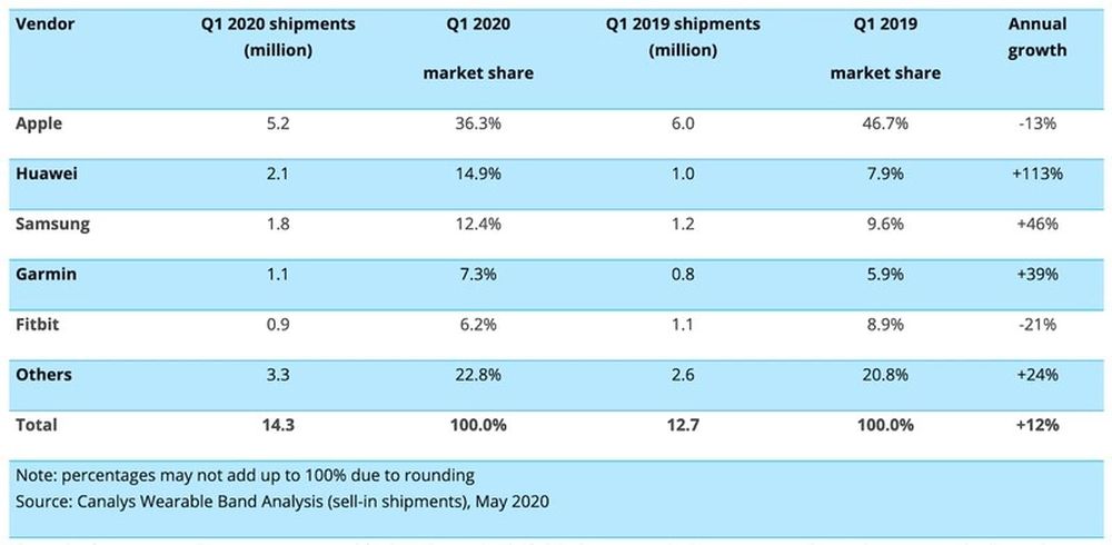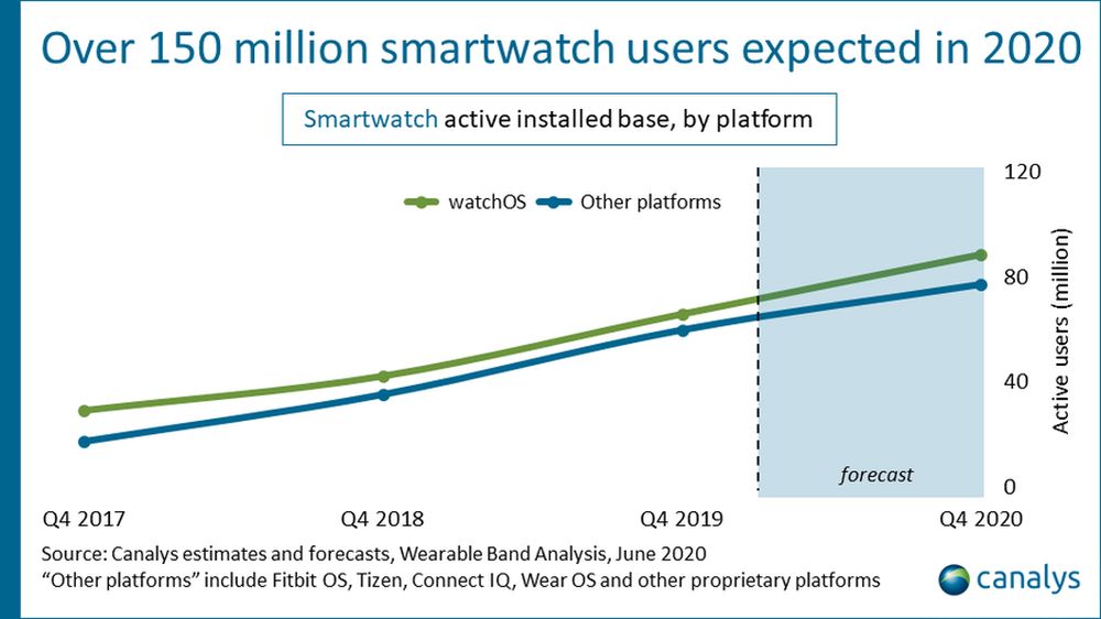 根据市场调查机构 Canalys 公布的最新报告,2020年第1季度 Apple Watch 的全球出货量为 520 万块,远超华为、三星和Fitbit。Canalys预计未来几个月内,Apple Watch的总出货量将达到1亿块。