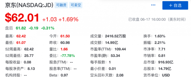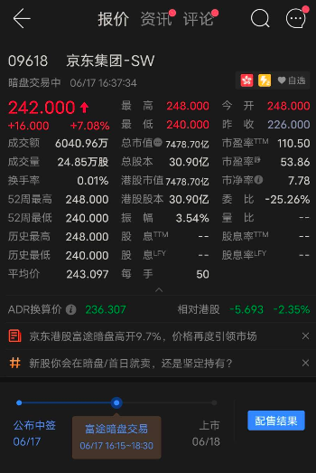 而在昨天的暗盘交易中,京东的表现也较为不错,收涨7.35%报242.6港元,成交9087.66万港元,总市值7497亿港元。