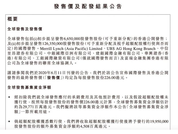 根据京东昨天发布的公告显示,其发售价定为每股226.00港元,全球发售募集资金净额约为297.71亿港元,超越网易,成为今年以来港交所最大规模的新股发行。