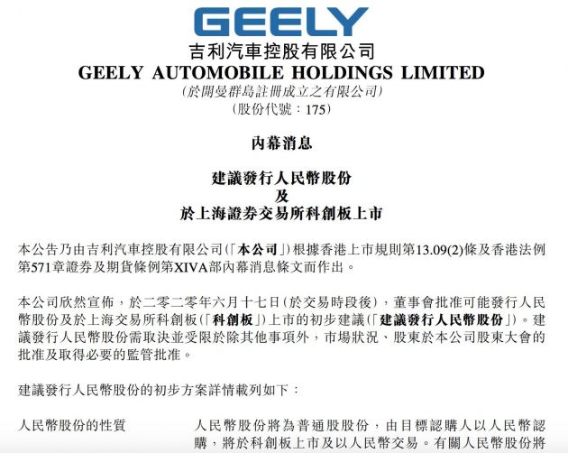 6月18日消息,吉利汽车发布公告称,于2020年6月17日,董事会批准可能发行人民币股份及于上海交易所科创板上市的初步建议。这意味着此前在香港上市的吉利汽车将回归A股。公告显示,人民币股份将为普通股股份,由目标认购人以人民币认购,将于科创板上市及以人民币交易,人民币股份将与香港股份形成同一类别普通股,均为新股份,且将不涉及转换现有股份。