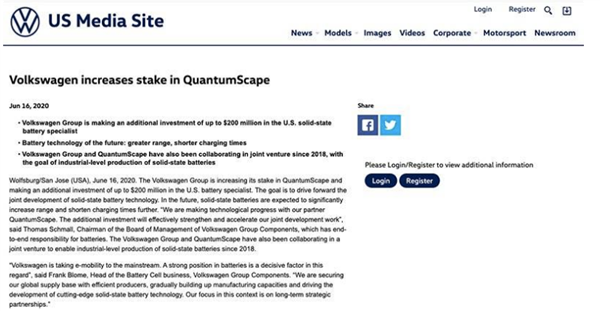 对于此次投资,大众汽车零部件管理委员会主席Thomas Schmall表示:“我们与合作伙伴QuantumScape正在取得技术进步,此次投资将会有效的增强我们对全固态电池的联合研发工作。”