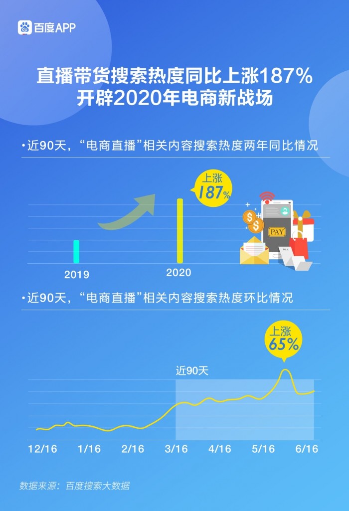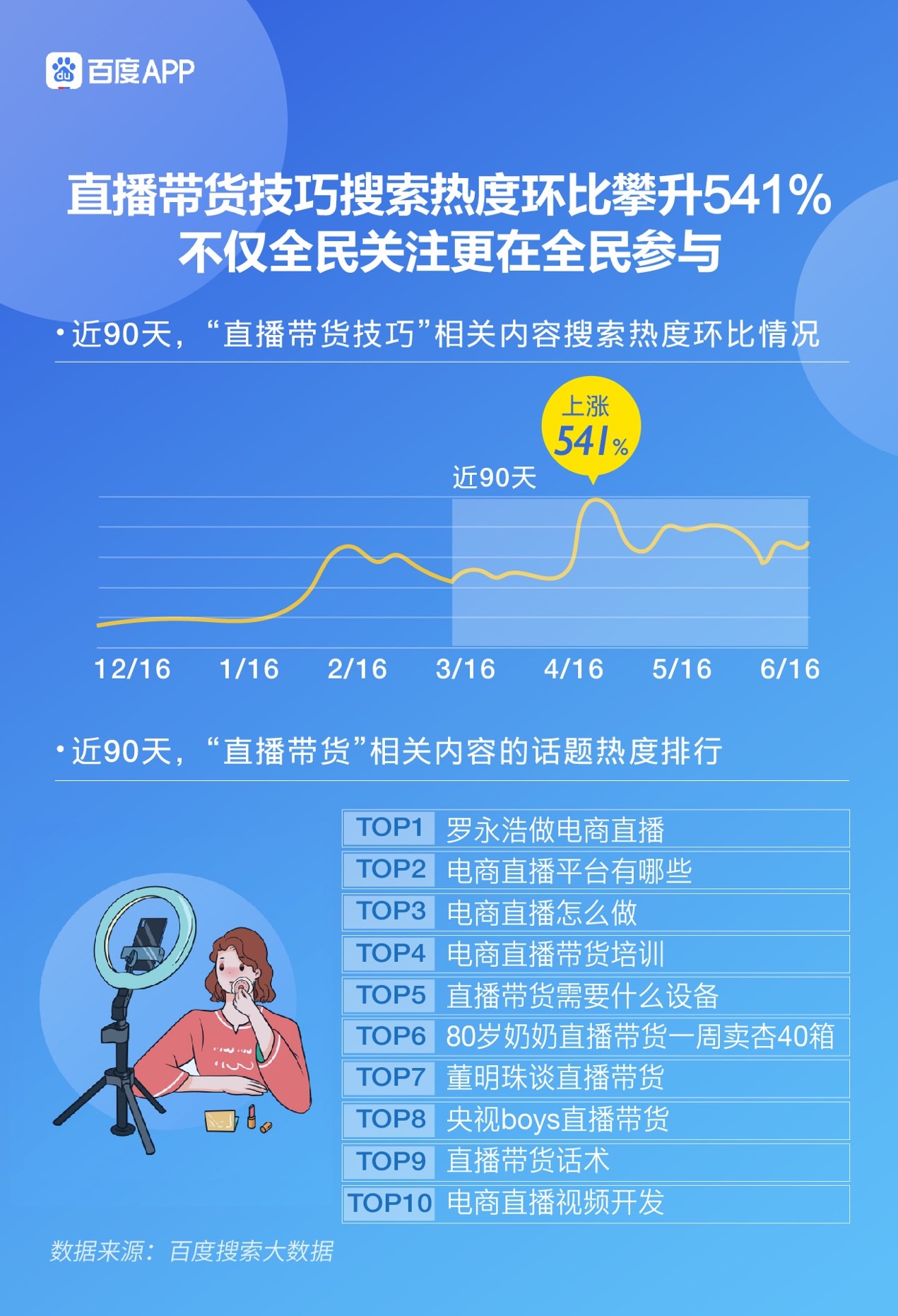 百度搜索大数据还显示,近90天,“直播带货技巧”的搜索热度环比攀升541%,“电商直播带货”相关话题搜索热度排行TOP10中,有6席是关于直播带货的技巧学习。从做“观众”到当“主播”,从“80岁老奶奶直播卖杏”到企业CEO和流量明星跨界直播带货,全民嗅到了直播带货的商机,正在纷纷涌入这场“直播带货的狂欢”中。