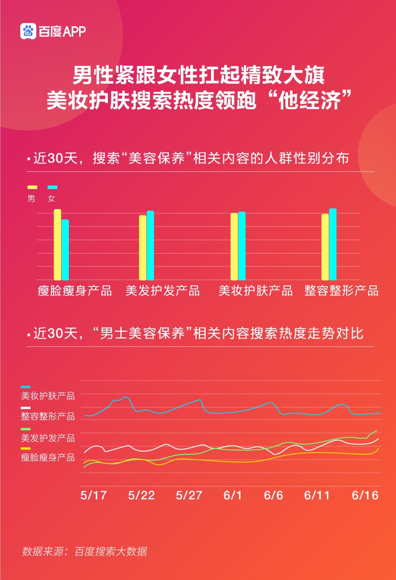 值得关注的是,数据显示,男性超前消费心理已超女性。与男性觉醒的消费欲望对应的是崛起中的“他经济”。当男人也开始“收拾自己”,带给相关品牌的既是一个潜力惊人的庞大市场,也是一个巨大挑战——如何精准定位男性在美容保养领域的细分需求?报告显示,在“他经济”跑道上,男性对“瘦脸瘦身产品”相关内容的搜索热度已经反超女性,对“美妆护肤产品“的关注也几乎追平女性。