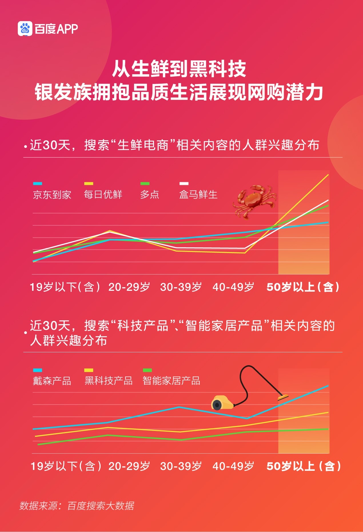 同时,报告也聚焦了被电商行业长期忽视的“银发族”。数据显示,50岁以上人群对“生鲜电商”、“科技产品”和“智能家居产品”相关内容的搜索兴趣远超其他年龄段群体。“戴森吸尘器”、“大疆无人机”、“扫地机器人”纷纷走进他们的视野。这也暗示着互联网在中老年群体中的普及度得到大幅提升,相当一部分中老年人已学会在网上自助“冲浪”——通过搜索去了解各种“黑科技产品”,甚至主动购买试用。