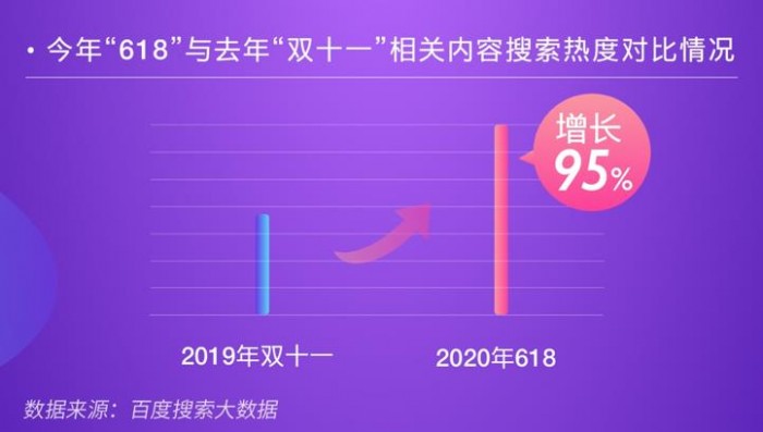 近日,百度发布《百度618电商搜索大数据报告》(以下简称“报告”),报告显示,今年“618”的搜索热度创五年新高。报告显示,今年“618”的整体搜索热度较去年双十一增幅高达95%。此外,今年网民对“618”的搜索热情在5月20日左右即被点燃。此外,“电商直播”搜索热度也在618迎来新高,“618电商直播间活动”等话题在列网民搜索热度排行TOP5中。