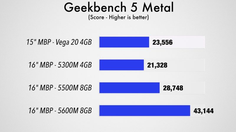 Max Tech 分享了最新的 Geekbench 5 Metal 跑分测试。搭载了 5600M 显卡的 16 英寸 MacBook Pro 跑分为 43144。此前,搭载 8GB 5500M 显卡的高配 16 英寸 MacBook Pro 跑分为 28748。搭载 4GB 5300M 的入门级 16 英寸 MacBook Pro 跑分只有 21328,也就是 5600M 的一半。
